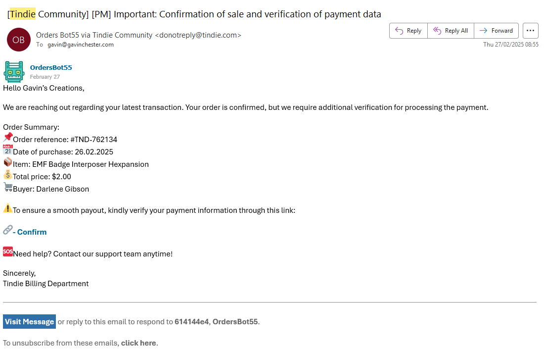 new scam link : emails. tindie. com/track/click/30145078/tindie.id742688.click?p=eyJzIjoiWGlJa2J3dGwzaHZON1ZuLTRJYTdmQ1RYNU13IiwidiI6MiwicCI6IntcInVcIjozMDE0NTA3OCxcInZcIjoyLFwidXJsXCI6XCJodHRwczpcXFwvXFxcL3RpbmRpZS5pZDc0MjY4OC5jbGlja1xcXC90cmFja2luZ1xcXC94RFR1dDZreEdWSVJld3FBXCIsXCJpZFwiOlwiY2E0NGEyMjEwMmY3NDBhYmFjY2MzNmI3MWZkNWQ0MGVcIixcInVybF9pZHNcIjpbXCI0OGYyMzVhYTU4OTY5MWFiMWJiNzAxODVmODJiMmU0NTRkZTQ1M2M5XCJdLFwibXNnX3RzXCI6MTc0MzY4NTU1OH0ifQ